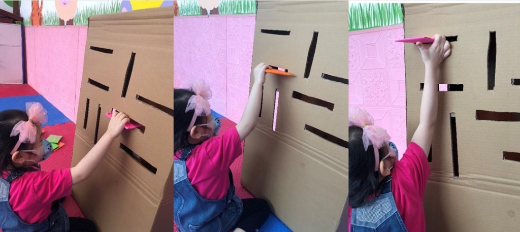 - Mintalah anak memasukkan kartu kedalam lubang sesuai ukuran kartu.