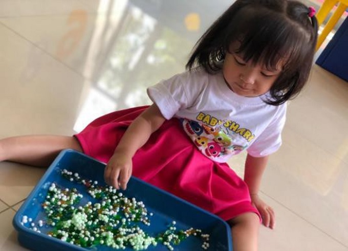 - Ajak anak untuk bermain water beads dengan segala kemampuan jari-jemarinya.