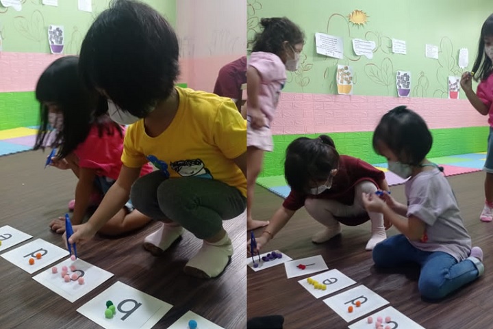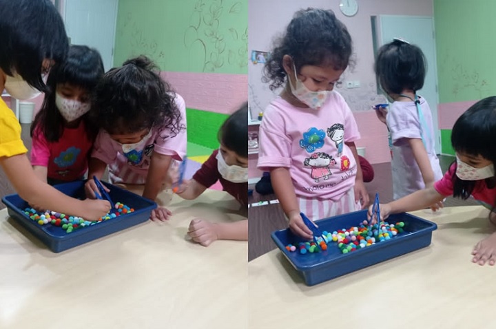 - Ajak anak-anak untuk mengambil pompom menggunakan tweezer dan meletakkan pompom pada kartu alfabet sesuai kelompok warna yang sudah ditentukan