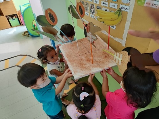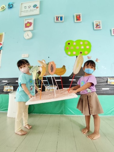 - Orang tua dapat memberikan contoh terlebih dahulu untuk mengambil buah atau sayur yang disebutkan, lalu menancapkannya pada Styrofoam.