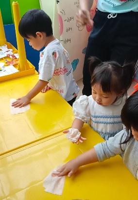 Pada gambar diatas terdapat gambar anak yang sedang membersihkan meja. Kegiatan membersihkan meja ini tidak hanya mengajarkan anak untuk menjaga kebersihan tetapi juga melatih fokus anak. Anak akan fokus membersihkan titik dimana terdapat kotoran. Selain itu anak kegiatan ini juga berfungsi melatih kekuatan otot tangan dan jari jemari anak. Karena anak akan mengeluarkan tenaga untuk menggosok bagian yang kotor. Kesabaran anak juga akan terlatih karena ketika anak membersihkan meja dengan mengeluarkan tenaga namun tidak bersih, maka anak akan langsung berusaha lebih keras.